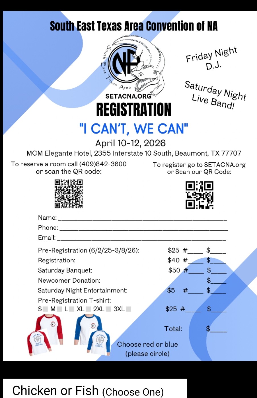 SETACNA 3Date: Apr 10, 2026Facilitator: Cindy B 4096262143 Co Facilitator: Roger P 4095549573 Registration, tshirts and room reservations can be found on the convention website Www.setacna.org Read more about SETACNA 3